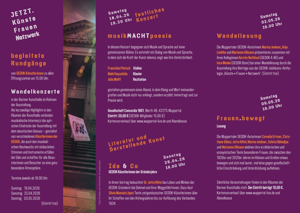 „100 Jahre GEDOK – Künste ∙ Frauen ∙ Netzwerk“: Unter diesem Motto feiert eines der größten und traditionsreichsten Künstlerinnen-Netzwerke im deutschsprachigen Raum 2026 seinen 100. Geburtstag. Mit Kunstausstellungen und Konzerten, Lesungen und Live-Performances, interdisziplinären Projekten und Podiumsdiskussionen im gesamten Bundesgebiet gewährt die GEDOK ein Jahr lang konzentriert Einblick in Geschichte und Gegenwart erfolgreicher Frauenkulturförderung.
